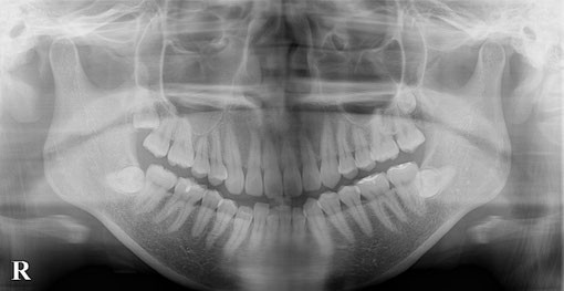 もちろん、実際にお口の中を拝見しないと確定的な判断はできませんが、日本人の場合、親知らずが正常に生えてくるスペースが不足しているケースが非常に多いです。例えば、手前の第2大臼歯に途中まで引っかかって生えていたり、完全に真横を向いて顎の骨に埋まっている「水平埋伏智歯」などがよく見られます。